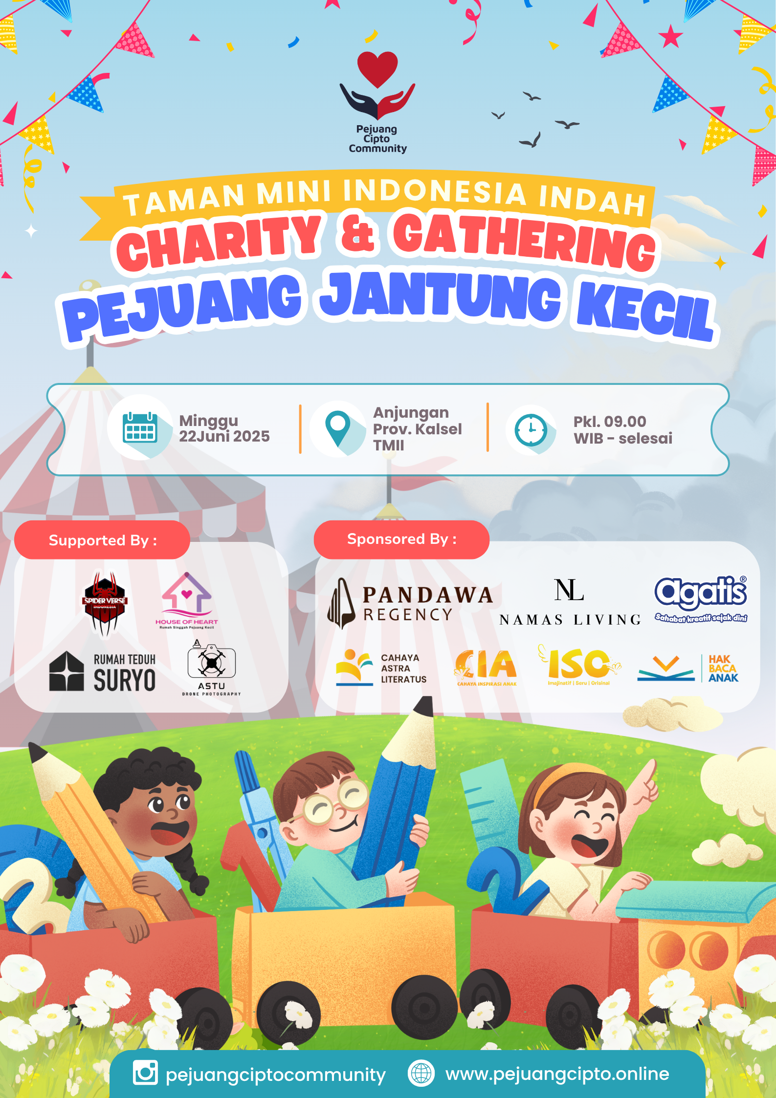 Di bawah langit cerah Kota Jakarta, Minggu pagi itu menjadi saksi kehangatan dan semangat luar biasa dari para orang tua dan anak-anak pejuang jantung bawaan yang tergabung dalam Komunitas Pejuang Cipto Community. Bertempat di Anjungan Provinsi Kalimantan Selatan, Taman Mini Indonesia Indah (TMII), acara Charity & Gathering Komunitas Pejuang Cipto Community 2025 berlangsung penuh haru, sukacita, dan cinta kasih.